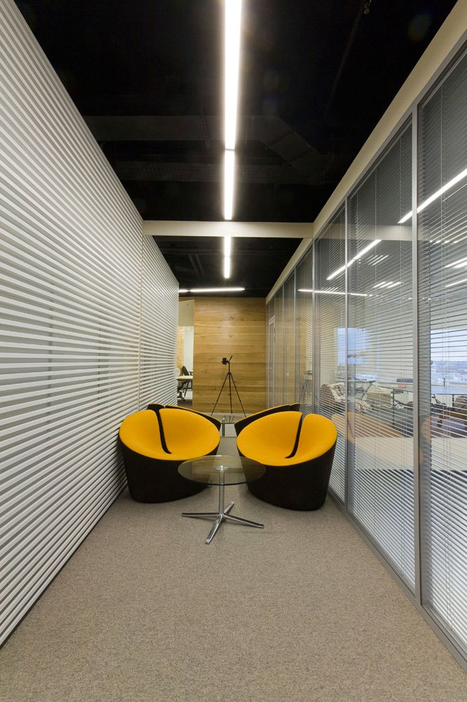 該場地呈方正矩形,因此設(shè)計圍繞中心使用功能而布局。首先必要的功能是衛(wèi)生設(shè)施,然后是其它必備的空間比如廚房與咖啡間,這些功能空間都有對水的需求。布局上,設(shè)計師保留了建筑原有的框架,不同的房間沿著走廊串了起來,透明的玻璃內(nèi)墻使整個空間變得柔和,橙色涂料的使用則為黑白灰的整體風格增添了一絲明快。走廊頂面從視覺上比實際層高要高些,工作區(qū)吊頂采用影院級的吸音材料,以減低環(huán)境噪音?;ヂ?lián)網(wǎng)線以及電線管道隱藏于架空地面,上面覆以地毯,這樣便于網(wǎng)絡(luò)的接口。雖然平面呈矩形,但在立面的處理上采用動態(tài)的斜面,以此豐富空間形態(tài)。
