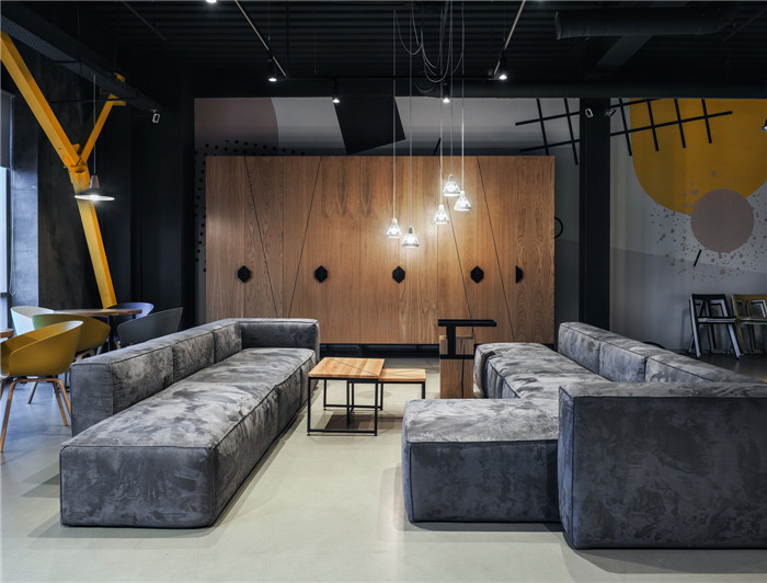 3、工業(yè)風(fēng)暗黑系辦公室設(shè)計(jì):極富張力的空間構(gòu)建、精彩的造型和圖形設(shè)計(jì)、暗黑色調(diào)中的藝術(shù)配色,整個(gè)空間在視覺的張力中呈現(xiàn)出工業(yè)時(shí)代的厚重感和當(dāng)代理念的時(shí)尚感。建筑內(nèi)部以槽鋼構(gòu)架呈現(xiàn)出原始粗獷的工業(yè)魅力,張弛有度的空間體量以及混凝土和木飾面又帶來親切的現(xiàn)實(shí)感。直白的空間構(gòu)建,加以色彩的輔助所產(chǎn)生的力量感和輕盈感,使整個(gè)空間充滿著視覺的張力和優(yōu)雅靈動(dòng)的藝術(shù)氣韻。室內(nèi)以開闊的木樓梯引導(dǎo)的中軸線規(guī)劃功能布局。木樓梯不僅緊密連接上下兩個(gè)樓層,也是多元化的活動(dòng)中心,面向?qū)?cè)的咖啡吧臺(tái),形成一處大型社交集會(huì)中心。在這條中軸線上還設(shè)有許多共享會(huì)議室等一眾輔助空間。中軸線兩側(cè)是工作區(qū),既有開放的共享工位,也有各種比例的獨(dú)立工作間。在整個(gè)暗調(diào)的氛圍中,設(shè)計(jì)團(tuán)隊(duì)以一抹亮黃驚艷了整個(gè)視覺!再加以深深淺淺優(yōu)雅晴朗的藍(lán)色,猶如一首輕盈悅動(dòng)的歌曲在空間流動(dòng)。