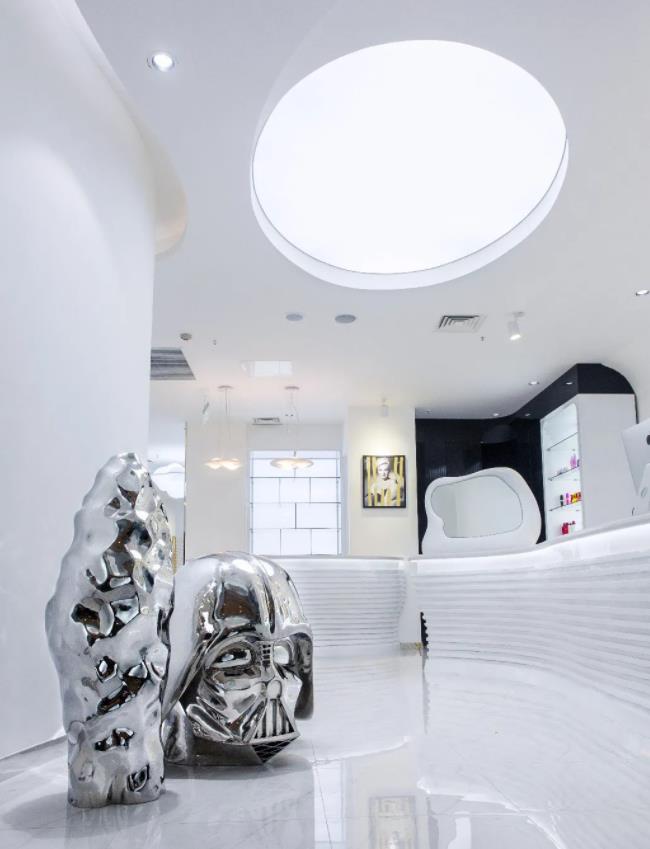 2、設(shè)計師用鏡面不銹鋼雕塑,巧妙融于時尚設(shè)計,呈現(xiàn)出個性閃耀的藝術(shù)特色。金屬鏡面的材質(zhì),形成反射,使空間層次更加豐富。前臺背景墻的鯨魚立體浮雕壁飾,簡約和優(yōu)雅的結(jié)合,有著高品質(zhì)且簡單舒適的生活態(tài)度。辦公樓前臺做曲線設(shè)計,邊緣的發(fā)光燈條,再次勾勒出前臺優(yōu)美的線條。高檔時尚的美發(fā)椅,加厚海綿坐墊,不銹鋼底盤,每一處都與空間融合。天花上不規(guī)則的燈,像是發(fā)著光的銀河。