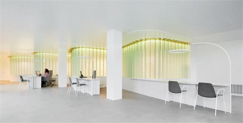 4、電力公司辦公室裝修案例,燈往往是要靠電才能發(fā)光,在這個(gè)辦公空間里,設(shè)計(jì)師采用一座光屏來(lái)改變空間動(dòng)線,成為主要吸引點(diǎn),借此詮釋了電的其一魅力。辦公室的外圍采用玻璃圍成,給內(nèi)空間景色造成透視感,讓人一眼可以看到室內(nèi)的光屏墻,波浪形光屏的凸面圍合出新的區(qū)域。光屏由垂直排列在隔墻周圍的平滑玻璃板構(gòu)成,這種玻璃可以讓光線疊加,上面是金色的弧形裝飾物,像一片片向日葵的花瓣,在燈光的暈染下,讓人安心享受這里的寧?kù)o與柔和。而這里的辦公桌設(shè)置,由光屏的基座展開(kāi),和曲面的光屏頂部平行,展現(xiàn)出更強(qiáng)的層次感,來(lái)訪者正是通過(guò)這樣連續(xù)而開(kāi)放的,空間逐漸進(jìn)入到辦公室的內(nèi)部。