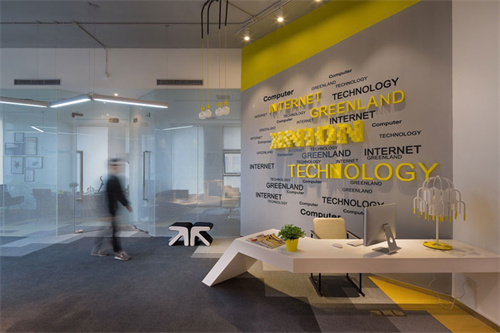1、600平方互聯(lián)網(wǎng)公司辦公室前臺設(shè)計(jì)的時(shí)候,由于空間自身具有其優(yōu)點(diǎn)——頂相對高,設(shè)計(jì)師希望可以將這個(gè)優(yōu)點(diǎn)聚焦加以放大,設(shè)計(jì)師將前臺設(shè)計(jì)成類似弧形的四分之二圓,同時(shí)放低其高度,讓墻壁可以完后自己的使命——形象墻,讓前臺空間的屬性可以在此基礎(chǔ)上承擔(dān)更多的責(zé)任。
