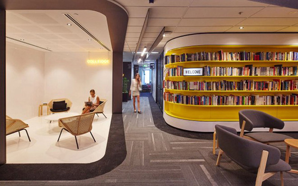 室內(nèi)*精彩的當(dāng)屬一處半圍合的“純白色房間”,白頂、白墻、白地,純凈的白色意在提供一個清晰的思維空間,讓創(chuàng)意靈感源源流動不被干擾。其它特色裝飾包括入口處的星火水晶玻璃墻、精美的天花、頂面定向裝飾的生態(tài)板、雙折門、特色照明燈具、豐富的地面材質(zhì)如木地板、塑膠地板和各色地毯、以及時尚的黑色儲物柜和漂亮的家具。