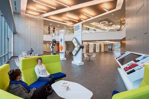 除了協(xié)作空間,設(shè)計團隊還設(shè)計了一處閱覽空間,給團隊成員提供一處寧靜的工作區(qū)。為了解決開放式空間所帶來的聲學(xué)問題,設(shè)計采取多種措施確保聲音的隱私性,以及視聽會議室和人多的房間的隔音性能。