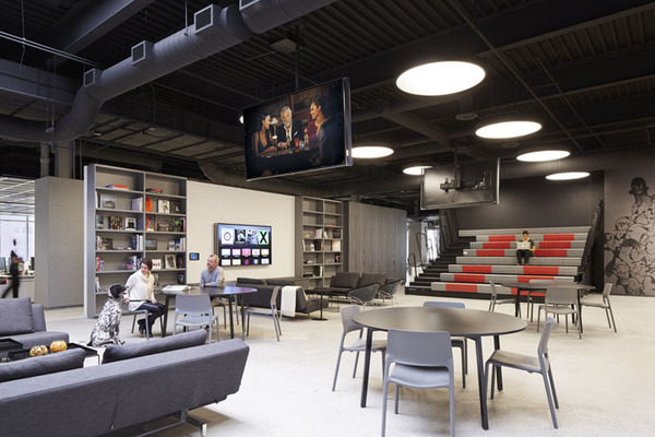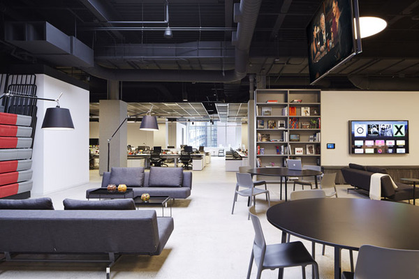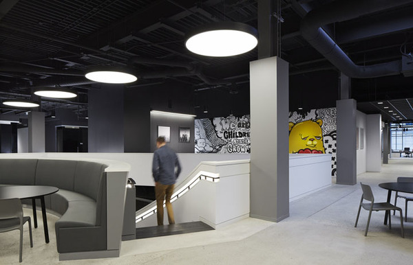 當(dāng)然作為創(chuàng)意公司,這里還規(guī)劃了一處大型集會(huì)空間,用以全體員工的聚會(huì)等活動(dòng)。各類(lèi)創(chuàng)新座位區(qū),比如在大型集會(huì)區(qū)用作空間分隔的階梯看臺(tái)座椅等。室內(nèi)的裝飾表面也具有多功能性,比如墻體和結(jié)構(gòu)柱大量運(yùn)用磁性玻璃、烤漆玻璃以及可黏貼或釘圖釘?shù)牟馁|(zhì),這樣可以隨時(shí)記錄創(chuàng)意構(gòu)想。