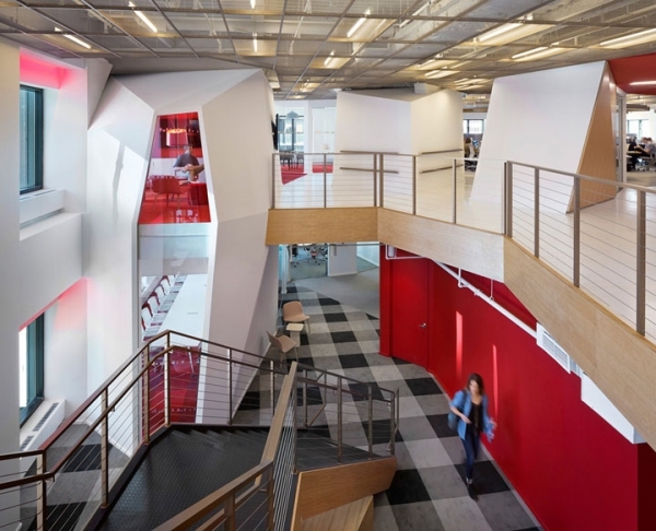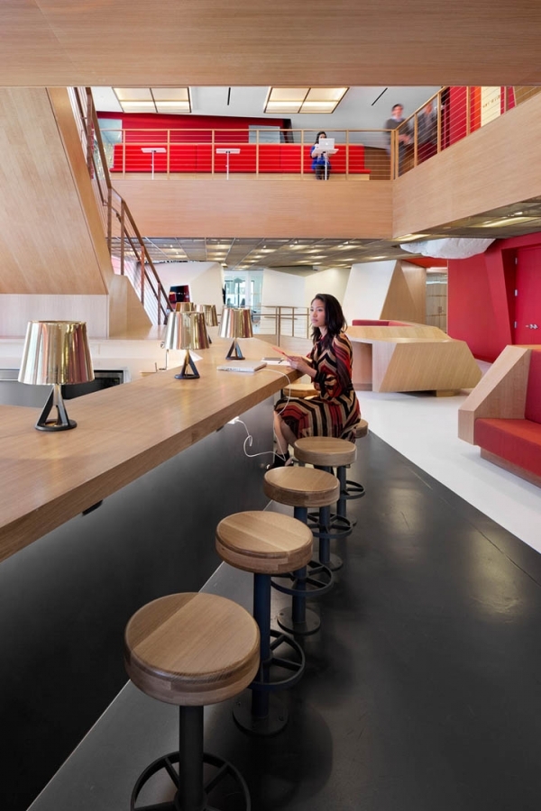 其它特殊功能區(qū)包括開(kāi)闊的中庭、休閑區(qū)、咖啡吧、酒館式空間等,這樣的設(shè)計(jì)旨在促進(jìn)大家更多的聚集和互動(dòng)交流,增加內(nèi)部的凝聚力,培養(yǎng)文化和知識(shí)的共享理念。