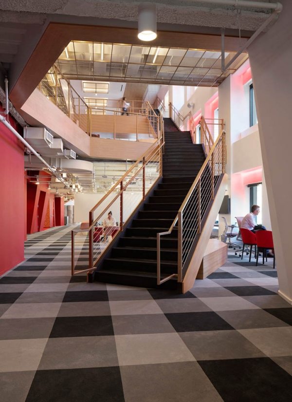 為了消除樓層間的孤立感,設(shè)計(jì)師創(chuàng)建一個(gè)活力動(dòng)態(tài)的工作空間,打造了共享中庭并增加一座連接各個(gè)樓層的中庭樓梯。設(shè)計(jì)以枝繁葉茂、盎然生機(jī)的“大樹”為概念,蓬勃伸展至各個(gè)樓層,衍生出本案的幾何形空間裝飾語(yǔ)言,由中央核心向周邊與頂面呈樹枝狀蔓延擴(kuò)展。