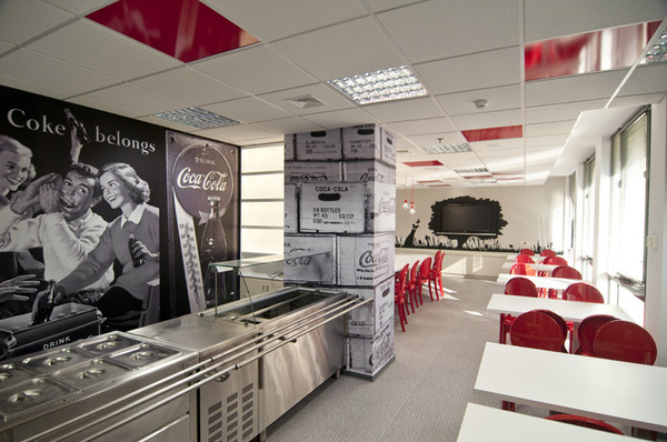 開放式的辦公空間強化了員工間的協(xié)調(diào)和交流,餐廳與休閑區(qū)域出現(xiàn)了大面積的復(fù)古元素,將可口可樂百年文化積淀的歷史傳承通過老海報融入到整體裝飾設(shè)計中,在跳躍的紅白色調(diào)中多了一份凝重和厚重感,也強化了可口可樂辦公室整體的企業(yè)氛圍與文化價值的傳達。
