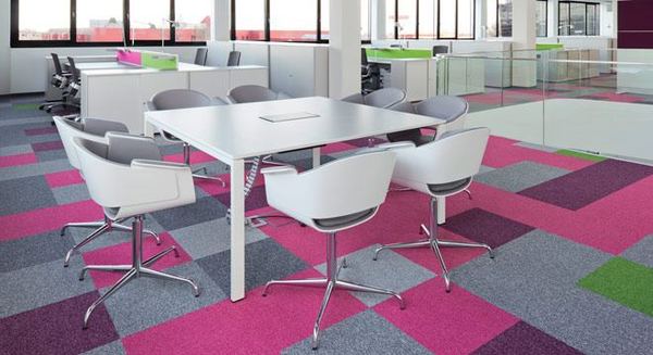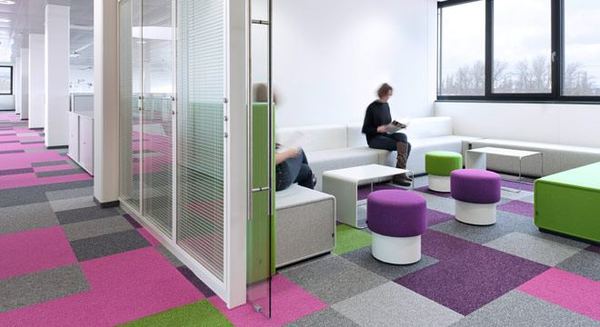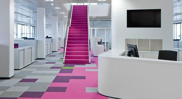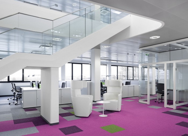 室內中庭一條寬敞的洋紅色樓梯將上下貫穿在一起,開敞的空間促進員工間的交流與合作。洋紅、魅紫和新鮮的草綠地毯,將中庭空間裝扮的猶如美麗的調色盤,優(yōu)雅清新靚麗。