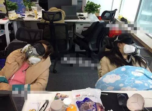 中午午休時(shí)間,兩名女員甚至戴著這種防毒面具,在座位上睡覺。記者發(fā)現(xiàn),戴有類似防毒面具的員工不下10人。
