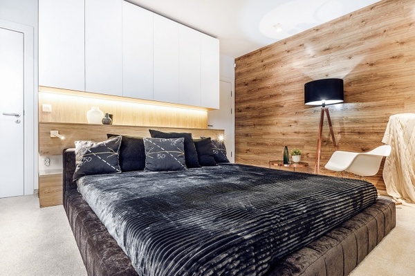 二樓為屋主的私人區(qū)域,以符合整體理念的木元素奠定了溫暖、柔和的睡眠環(huán)境,深色天鵝絨的雙人床華麗又現(xiàn)代,利用床頭背景柜滿足臥室的儲物需求。