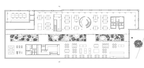 綠植陽光房的一側(cè)為提供休息座椅的雙層空間,中心區(qū)域的白色體塊包含了一個衛(wèi)生間與大理石臺面的咖啡間。陽光房的另一側(cè)為兩層辦公空間,通過旋轉(zhuǎn)樓梯連接。同時,建筑立面上增加了一排大窗戶,以擴大從街道到辦公室內(nèi)的視野。