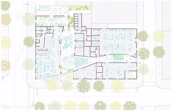 這樣的設(shè)計手法,給予室內(nèi)空間相互關(guān)聯(lián)。同時,設(shè)計者還對建筑入口進(jìn)行了從視覺化的處理,移除面向西南角的三角形的區(qū)域,改為透明的立面,將被涂鴉的磚墻重新組裝,以制造出不同的涂鴉樣式,以此表現(xiàn)建筑以及社區(qū)間層層疊加以及穿插的歷史。