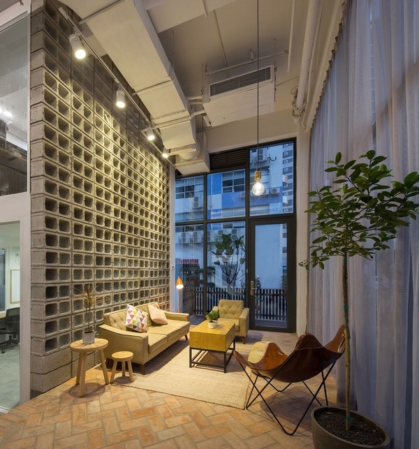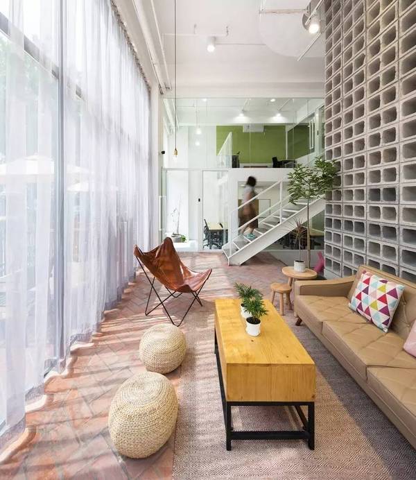 由一十一建筑改造設(shè)計的位于深圳的一棟聯(lián)合辦公空間,建筑由一棟工業(yè)建筑的首層一部分改造而來。由于室內(nèi)具有很高的天花,在確保自然光線能達(dá)到場地較深區(qū)域的前提下,設(shè)計者在局部區(qū)域設(shè)計了夾層。利用天花的高度,創(chuàng)造出更多的變化形式。同時,利用一系列戶外建筑材料使用在室內(nèi)空間,作為重要公共區(qū)域的特色景觀墻,紅磚在室內(nèi)于室外的連續(xù)鋪設(shè),以模糊室內(nèi)外邊界和處理高差。