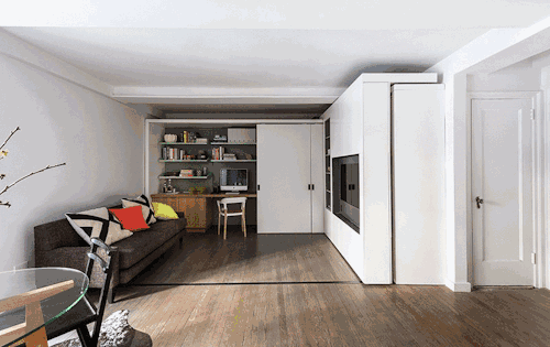 這面移動電視墻可以將整個空間隔離成五個空間。
