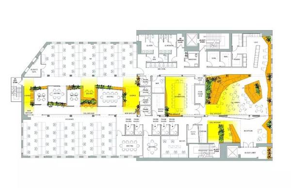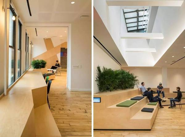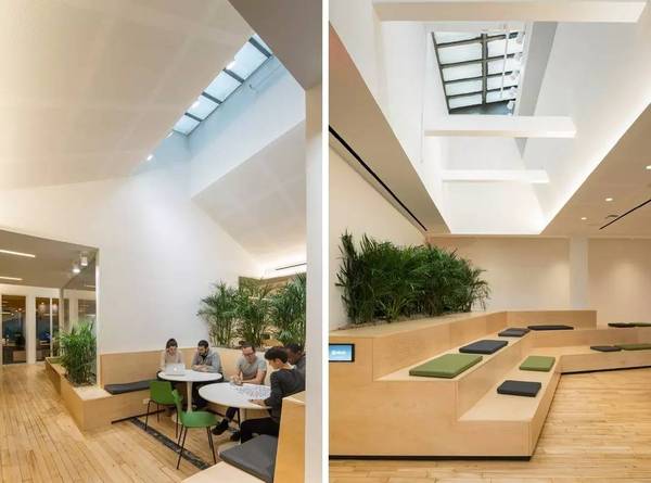 Sn?hetta對Slack新紐約空間設計的靈感來源于**特色的城市小院。從Paley Park的室內景觀中吸取靈感,竹植物提供自然的隱私屏幕,并為綠化帶來空間。現(xiàn)有四個天窗與放大,八字天花板大大增加了室內以及內部小庭院的自然光線。