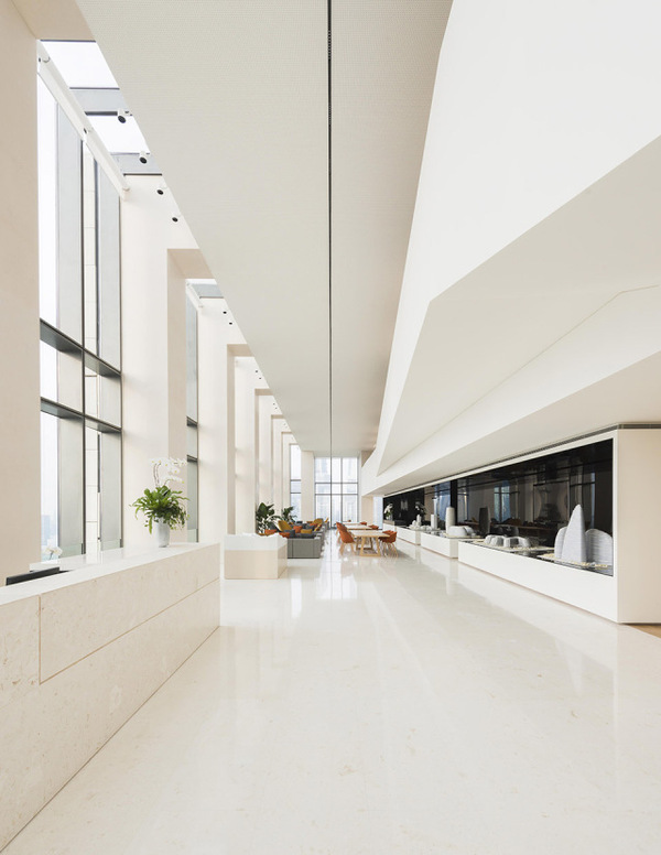 室內和室外同時使用了簡化的米黃色的石材,作為對于外灘老上海建筑的一種追溯,還使用仿佛能把人帶入未來的簡潔而堅硬的白色墻面。此外還有許多的小細節(jié):電梯廳附近45度的傾角;奶油色的石材使得空間看上去更加開闊;明亮的光照,在上海的古老和現(xiàn)代之間尋找到平衡。