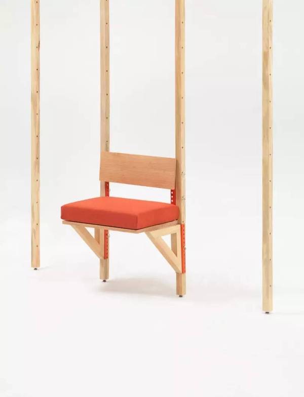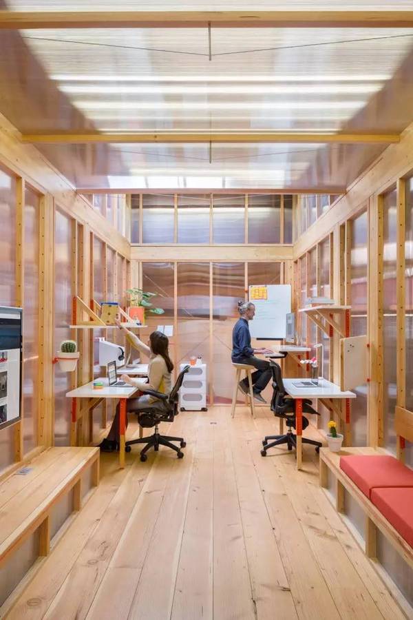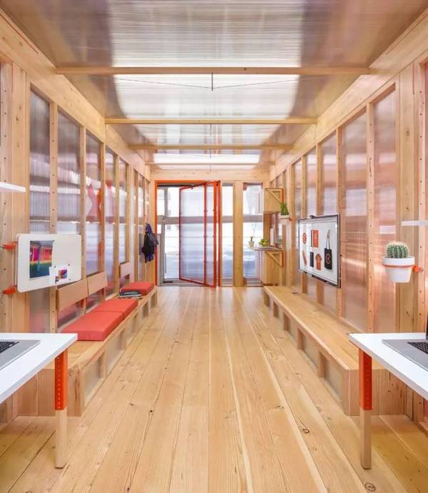 設(shè)計(jì)師保留了拖車的后梁結(jié)構(gòu),使用聚碳酸酯面板作為整個(gè)辦公室的墻壁。這種材質(zhì)的面板允許大量光線填充空間,同時(shí)也能吸收一些自然光,使得室內(nèi)光線不那么刺眼。設(shè)計(jì)師用從本地采購(gòu)的道格拉斯冷杉木來(lái)與半透明的墻壁搭配。 此外,他們還大膽的采用紅色以及其它鮮艷的顏色來(lái)活躍氣氛。