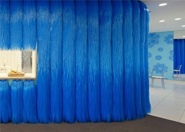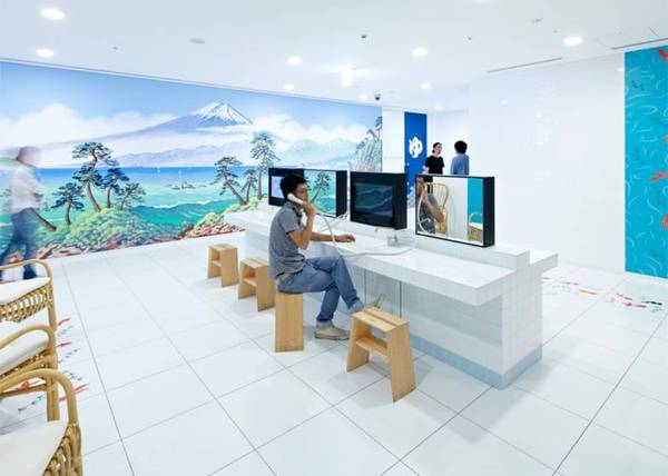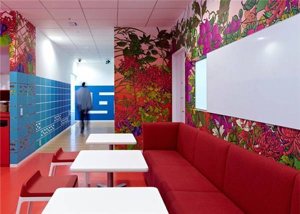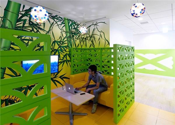 眾所周知,Google的logo由藍(lán)、紅、黃、綠四種顏色組成。這么多鮮艷的顏色混在一起,在進(jìn)行辦公室裝修時難免會面臨必須避免雜亂感的難題。但Google是不會放棄展示自我個性的,尤其是在進(jìn)門處這么顯眼的地方。而聰明的設(shè)計師選擇了通過軟裝修來協(xié)調(diào):黃色的接待臺,紅色的壁紙,綠色的“吉祥物”,以及地上藍(lán)、紅、黃、綠四色地毯,這些無不與墻上的logo相呼應(yīng)展現(xiàn)了錯落有致的層次感。壁紙上的和風(fēng)花紋,黃、藍(lán)、綠三色營造的仿若沙灘、海水和椰子樹的環(huán)境,再加上仿若沙灘椅的座椅,都展示了日本作為一個島國的特色。