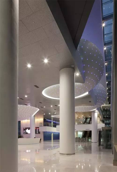 運用現(xiàn)代簡潔的設計手法,高雅明快的色調,精致和諧的材料,設計師成功營造出一個純粹干凈的國際化企業(yè)空間氛圍。中性高雅的色調成為空間的背景,而一些高科技的設備及材料:比如激光投射燈、穿孔金屬板的運用,則表現(xiàn)出信息時代敏銳、高速的特色。通過合理組織參觀流線,有效串聯(lián)功能空間,設計強化了室內環(huán)境與內院環(huán)境、室外環(huán)境的聯(lián)系與互動,做到空間次序明確同時各部門又各具特色。建筑良好的視線及引入建筑的陽光、綠化,則充分與小型討論區(qū)、會議單元、咖啡區(qū)休息區(qū)結合起來,使辦公環(huán)境輕松化、特色化、人性化。