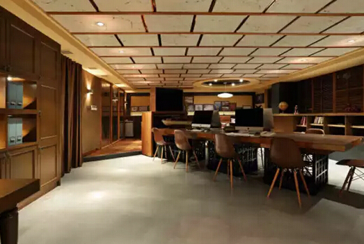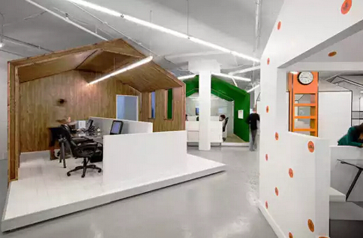 創(chuàng)意辦公室裝修,*主要的是與眾不同的體現(xiàn),進入辦公室給人一種眼前一亮的感覺??紤]到陽光朝向?qū)k公環(huán)境的影響,室內(nèi)桌子和電腦顯示器遮蔽在靠南的陰影下,另一側(cè)的墻壁擺放各種物件,亂中有序。設計師特別通過色彩對透明開放和封閉的兩部分進行對比,室內(nèi)加上明快的顏色,白色、黃色、綠色。透明弧形窗的部分,其室內(nèi)的地面和墻面是鮮亮的黃色與綠色,與室外的色彩一致,生機勃勃。