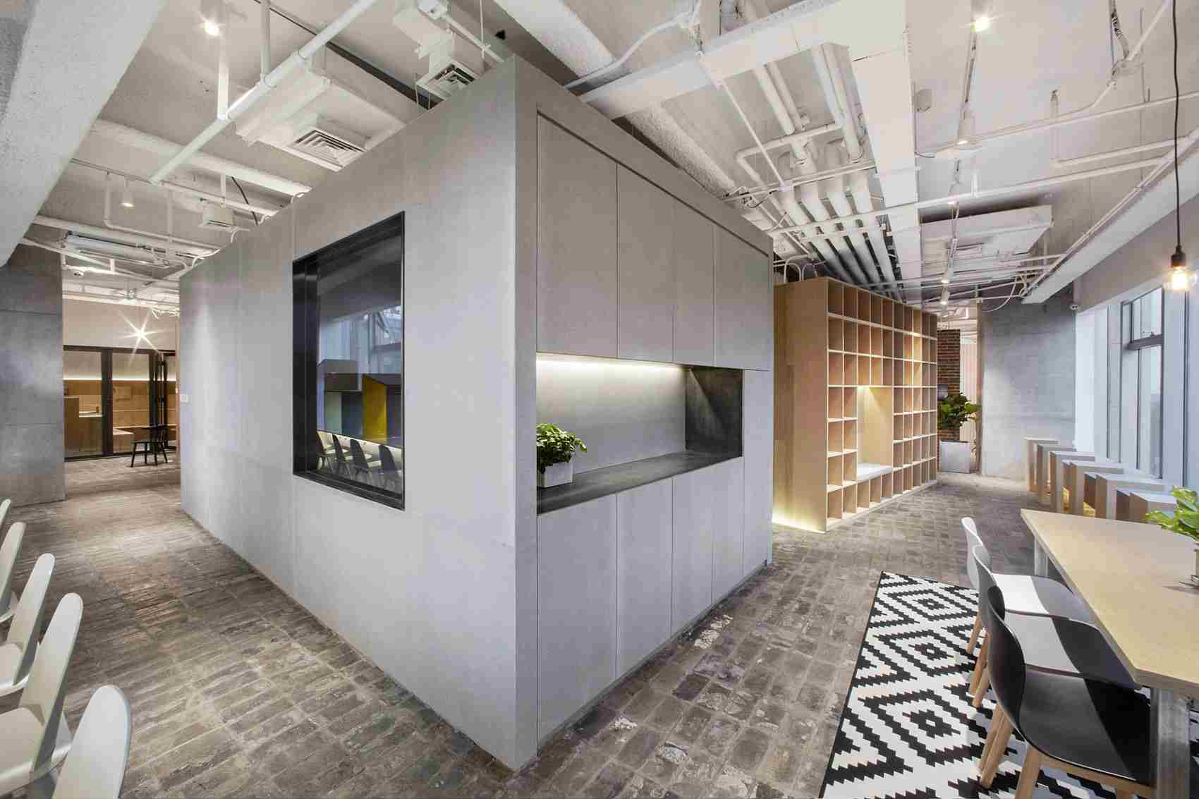 項(xiàng)目位于一座辦公樓內(nèi),業(yè)主租賃三個(gè)房間作為學(xué)校的辦公和培訓(xùn)區(qū)域。為了整合全部的空間的使用,設(shè)計(jì)師將其打通成為一整個(gè)房間。▼功能分區(qū)示意圖?本案的空間的設(shè)計(jì),與傳統(tǒng)的教室的設(shè)計(jì)有所不同。設(shè)計(jì)的核心概念為社區(qū),它由五個(gè)不同材質(zhì)的盒子,圍合出功能不同的區(qū)域空間,比如,書房,廚房,辦公交流等公共區(qū)域。房間內(nèi)則是教室,每個(gè)房間都擁有良好的視野和光線。▼“社區(qū)”是設(shè)計(jì)的核心概念,”??▼設(shè)計(jì)師將辦公樓層打通成為一整個(gè)房間??▼不同的盒子圍合出功能不同的區(qū)域空間???入口處,兩扇2000mm寬的大門設(shè)計(jì),當(dāng)玻璃門打開時(shí),室內(nèi)和走廊形成了相對(duì)開放的空間。房間使用了不同的材質(zhì),鍍鋅鋼板,水泥板,木板,紅磚,作為盒子的表面材料。地面則使用了灰磚,地面的破舊感和房子的不同材質(zhì)的對(duì)比,形成很大的反差,給人以強(qiáng)烈的視覺沖擊力。??▼寬闊的玻璃窗為教室?guī)?lái)良好的視野和光線?▼每個(gè)盒子使用了不同的材質(zhì),如鍍鋅鋼板、水泥板、木板、紅磚等??▼粗糙的灰磚地面和混凝土立柱帶來(lái)材料上的反差???