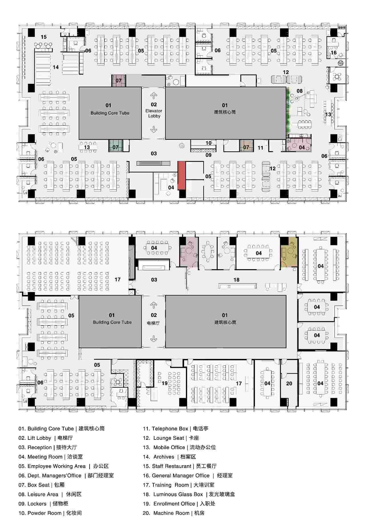 ![]() 中原地產(chǎn)在深圳經(jīng)過二十年的深耕,目前區(qū)域員工達(dá)到11000多人,是深圳規(guī)模**的專業(yè)地產(chǎn)代理公司。Peng & Partners (P&P)為其位于深圳后海的新總部辦公空間進(jìn)行了大刀闊斧、革命性的設(shè)計(jì)。 ?作為一家港資企業(yè),其過去20年的發(fā)展中,一直秉承著拼搏進(jìn)取、專業(yè)嚴(yán)謹(jǐn)?shù)南愀劬瘢@也反映在老的辦公空間的形象上。在當(dāng)下的重要時(shí)間節(jié)點(diǎn),企業(yè)希望融合深圳大膽創(chuàng)新的精神,活力、開放與協(xié)作。 ![]() 整個(gè)項(xiàng)目包含建筑的四層樓,三層為辦公樓層,另一層為會(huì)務(wù)中心層。 大廳天花頂部的開孔與立面的開孔相呼應(yīng),呈現(xiàn)豐富而有趣的空間構(gòu)成和層次的延伸感。 ![]() ![]() “盒子”的概念貫穿整個(gè)設(shè)計(jì),通過相減、擠壓、鑲嵌、堆疊等, 對(duì)基礎(chǔ)的方塊進(jìn)行加工變形,產(chǎn)生不同的正相和負(fù)相空間,以不同組合方式,串聯(lián)起來。盒子的不同開口方向和尺度,呈現(xiàn)出有趣的對(duì)比關(guān)系和節(jié)奏:私密與開放、狹窄與舒張、幽暗與明亮… ![]() ![]() ![]() ![]() 每個(gè)單獨(dú)的盒子,被賦予簡單純粹的色彩和材質(zhì),比如包裹墻面和天花的彩色吸音毛氈,有效降低與其他區(qū)域的相互干擾,實(shí)現(xiàn)**的聲學(xué)效果。人在里面活動(dòng)時(shí),空間和人的關(guān)系,以及人與人的關(guān)系變得更緊密而有趣,同時(shí)獲得一種沉浸式的空間體驗(yàn),使討論或工作變的更放松和專注。 ![]() ![]() ![]() 為了弱化傳統(tǒng)辦公室的緊張氛圍,公共休閑區(qū)配置了特別大的面積,包括大面積的垂直綠化墻、廚房及水吧。成為員工聚會(huì)、休息,或工作交流、頭腦風(fēng)暴的聚集地。模塊化的沙發(fā),能實(shí)現(xiàn)多變的組合方式,以及滿足員工360度全方位的無障礙溝通。 ![]() ![]() 9㎡部門經(jīng)理辦公室,在功能布置上做了很大的改變和創(chuàng)新,所有的功能構(gòu)件沿著空間四周墻面布置,儲(chǔ)物、辦公、休閑、閱讀及交流等,非常巧妙的銜接,使得小面積卻擁有寬敞舒適之感。 ![]() ![]() ![]() 會(huì)務(wù)中心層的發(fā)光玻璃墻,滿足了整個(gè)空間的照明,同時(shí)又成為空間的視覺核心,營造出純粹、安靜、脫俗的藝術(shù)辦公空間氛圍。 ![]() ![]() ![]() ![]() ![]() ![]() ![]() ![]() 整體空間的人流動(dòng)線簡潔清晰,工作交流快速**。 ![]() ![]() ![]() ![]() ![]() 空間的平面指示系統(tǒng)設(shè)計(jì),結(jié)合簡潔的造型體塊、線條和光線,呈現(xiàn)出耳目一新、時(shí)尚優(yōu)雅的氣質(zhì)。 ![]() ![]() 整個(gè)設(shè)計(jì)過程中,都在嘗試對(duì)傳統(tǒng)的辦公方式帶來改變,創(chuàng)造一個(gè)嶄新愉悅的工作體驗(yàn)。 ![]() ![]() ![]() ![]() 平面規(guī)劃: 依據(jù)場(chǎng)地的條件,以及體現(xiàn)企業(yè)文化和對(duì)員工的關(guān)懷,優(yōu)先保證各個(gè)部門擁有*有利的采光、通風(fēng)和*佳的景觀視野,員工辦公區(qū)域設(shè)置在靠窗的位置,部門參照柱位劃分。其余的功能區(qū)塊,如儲(chǔ)物、洽談區(qū)、影印室以及電話亭等,沿建筑核心筒集中排列。 ![]() |