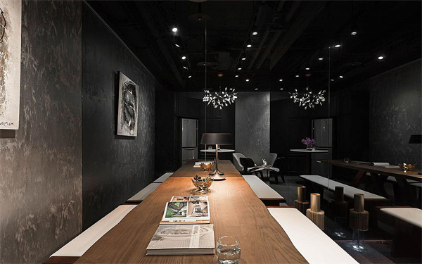 2、現(xiàn)代風(fēng)辦公室茶水間裝修設(shè)計(jì):壁面刷上特殊漆,利用手繪的溫度創(chuàng)造視覺層次,結(jié)合主燈及點(diǎn)狀燈的光影烘托,**提升空間質(zhì)感。此外,茶水間內(nèi)部除了擺設(shè)圓桌、跳色單椅外,更安排了一張木質(zhì)長桌,增加座位席,同時亦為空間注入溫潤感受,更運(yùn)用收納高柜將各式電器藏于立面中,辦公室設(shè)計(jì)師巧手將坪效發(fā)揮得****,打造宛如VIP等級的休憩空間。