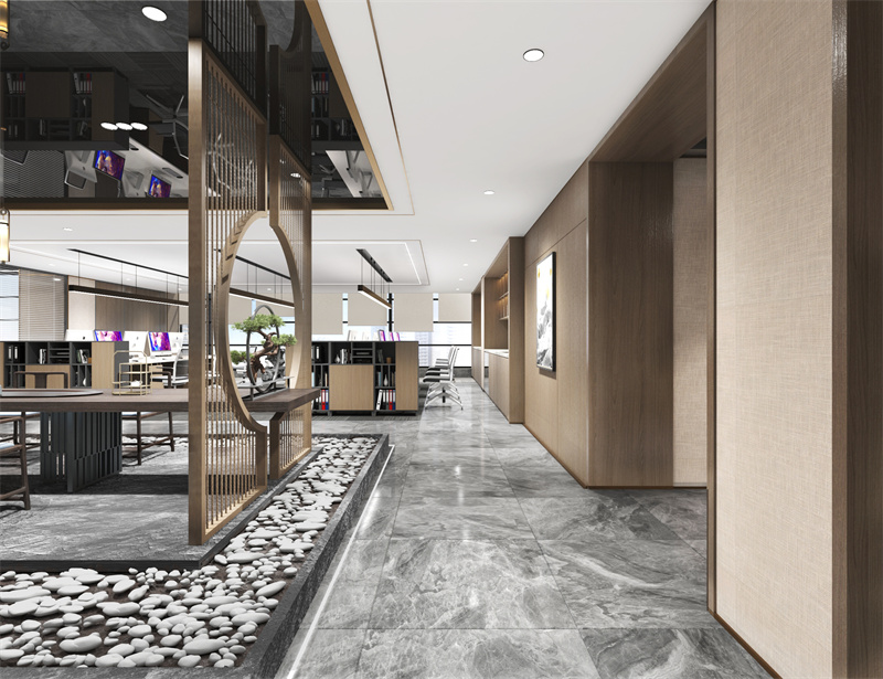 3、新中式開(kāi)敞式辦公區(qū)設(shè)計(jì)效果圖