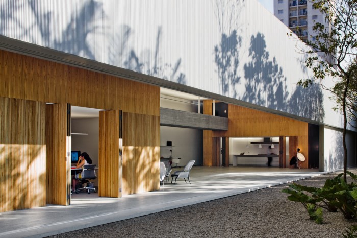 千羽工作室的建筑在長(zhǎng)方形的土地上被分為兩部分,北部是43.5米長(zhǎng)7.2寬的花園,南部為43.5米長(zhǎng)12.2米寬的工作室主體結(jié)構(gòu)。工作室的入口在花園一側(cè),通過(guò)一排滑動(dòng)的金屬門可以進(jìn)入到工作室內(nèi)?;瑒?dòng)門全部打開(kāi)可以直接與外部花園共享,進(jìn)入建筑內(nèi)可以看到一個(gè)混凝土人行道在空中將兩個(gè)木制盒型的空間鏈接,而且具有很強(qiáng)的視覺(jué)沖擊力。