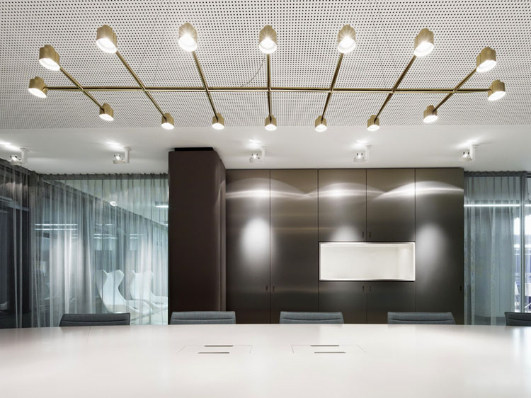 其概念是設(shè)置一個(gè)為所有部門共用的交流空間,以及滿足不同協(xié)作需要的不同分區(qū)。原先單獨(dú)、分散化的辦公室變成大型開放式的辦公空間,鼓勵(lì)同事之間的交流。每一個(gè)樓層都有單獨(dú)的辦公室和單獨(dú)的工作組空間,以及大型開放式工作間。各個(gè)工作站的工作人員能夠相互交流。玻璃立面的辦公室中,十字形的結(jié)構(gòu)將開放式的空間分隔為各個(gè)單元,但又是集中的工作環(huán)境。一系列暖色調(diào)的材料營(yíng)造出不同的氣氛,有時(shí)候讓員工感覺到像在家里一樣。辦公樓中的地毯有著清晰的路徑指示和功能分區(qū)。就餐區(qū)地板上的綠點(diǎn)如同變魔術(shù)一樣變出草地的效果,構(gòu)筑起通向露臺(tái)的一道概念式的橋梁。向露臺(tái)打開的半圓形裝飾空間與其他部分區(qū)分開來(lái),透明的蕾絲幕布構(gòu)成了半私密的空間,而清新的色彩、深藍(lán)色的桌子和粉色的地毯,無(wú)不為員工帶來(lái)激發(fā)工作情緒的氛圍。